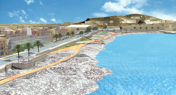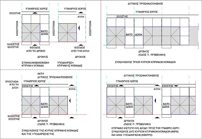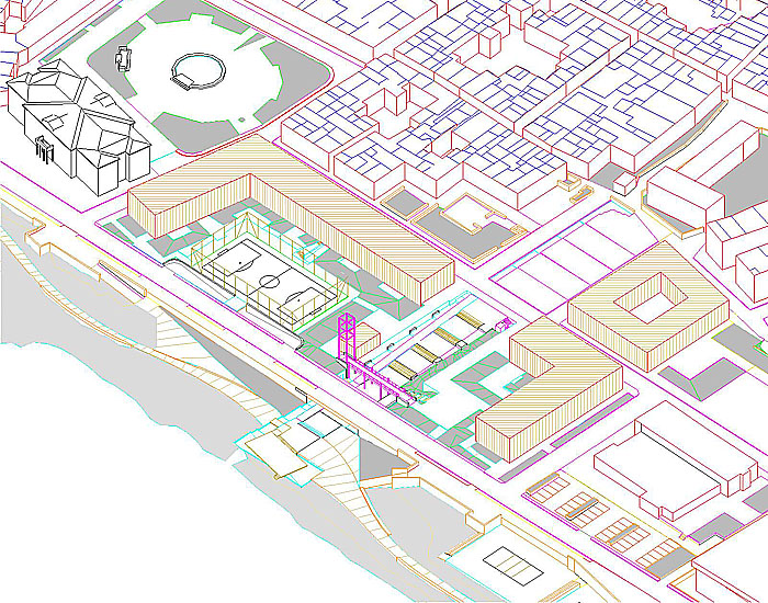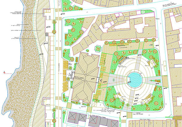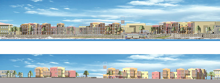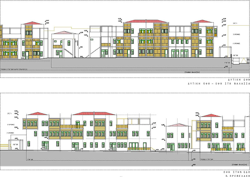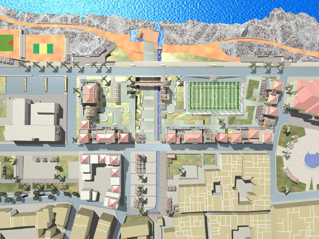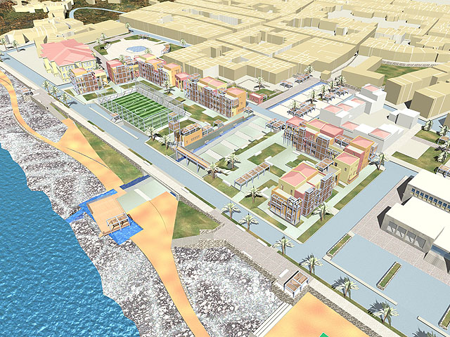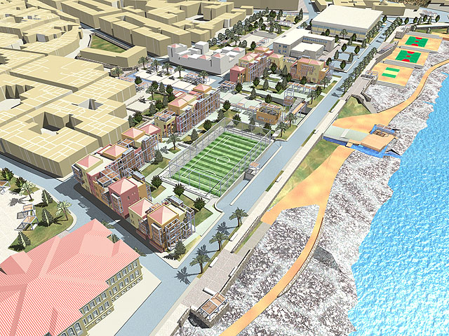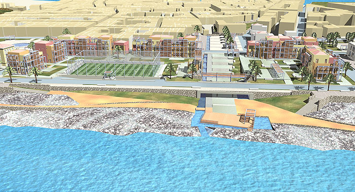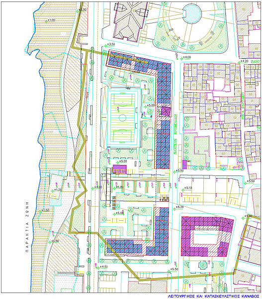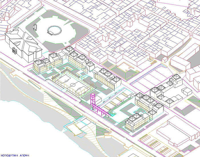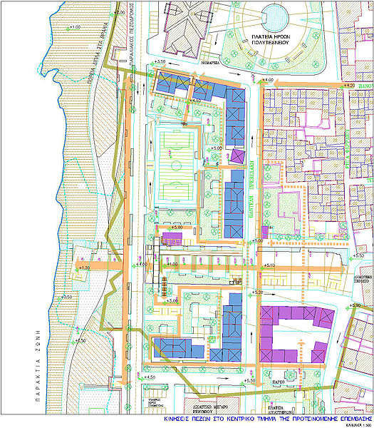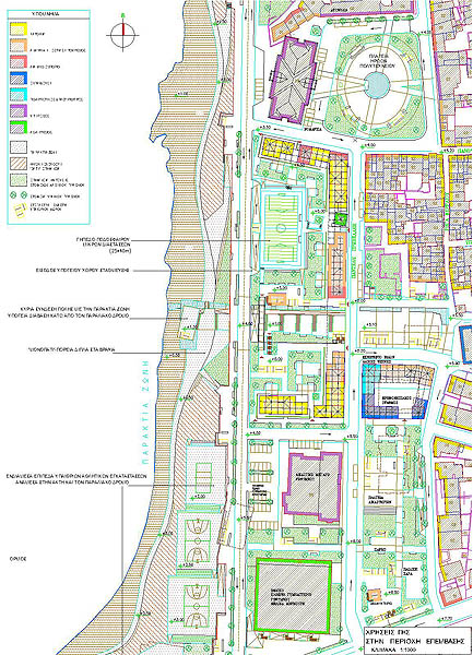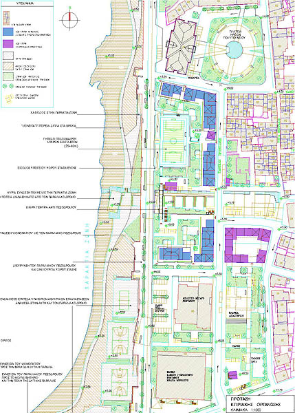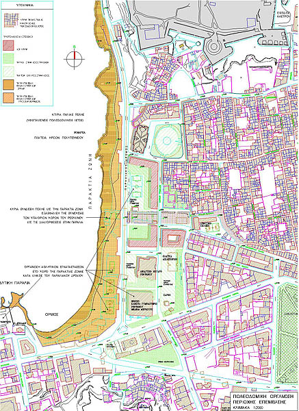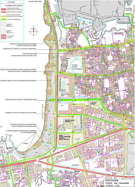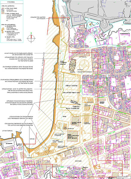 Ο παραλιακός δρόμος υποχωρεί από το όριο του Παραλιακού Μετώπου προς τα κτίρια που ήδη υπάρχουν (Νομαρχία, Δικαστήρια, Κλειστό Γυμναστήριο), ώστε να αφήσει ελεύθερη παράκτια επιφάνεια στην οποία καταλήγουν πεζόδρομοι από την Παλιά Πόλη. Κατά μήκος της Νέας Ακτής δημιουργείται περίπατος. Το ποδοσφαιρικό γήπεδο που καταλαμβάνει περίπου σήμερα μεγάλο ποσοστό της επιφάνειας της χερσονήσου, αφαιρείται, μέρος των ετερόκλητων κτιρίων που υπάρχουν στο χώρο κατεδαφίζεται, ενώ όσα διατηρούνται διαμορφώνουν μαζί με νέα που προστίθενται στις περασιές των πεζοδρόμων της Παλιάς Πόλης, εκατέρωθεν κτιριακά μέτωπα που δημιουργούν οπτικές φυγές προς την Δυτική Παραλία.